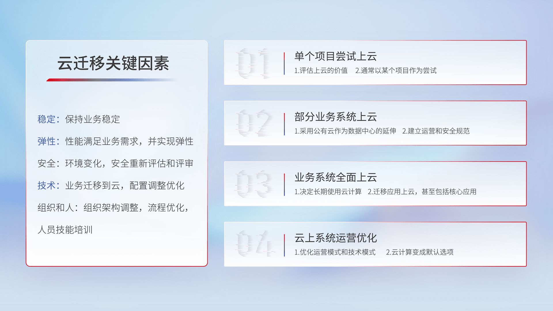 结合实际业务,,从规划设计、、云平台选型、、、云原生改造、、数据迁移、、集成交付,,,迁移全过程为客户识别最佳上云路径,,,做好风险识别管理,,设计网络架构、、、、身份权限、、安全审计合规、、操作审计、、、、日志审计、、、监控告警策略、、、、多站点容灾设计等,,,,对云上基础设施进行整体规划,,,提升IT治理水平,,,以满足弹性、、、高可用、、、高性能的需求。。。。